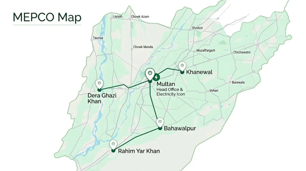The MEPCO map shows the electricity distribution area under MEPCO in Southern Punjab, Pakistan. It highlights the major cities, key boundaries, and the full coverage of MEPCO’s service region. The map also provides a visual reference of MEPCO’s head office in Multan and the areas where electricity services are actively managed.